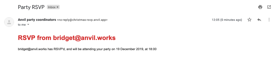 anvil.server.call('rsvp', party, respondent, rsvp)Now, your host will get an email each time they receive an RSVP!