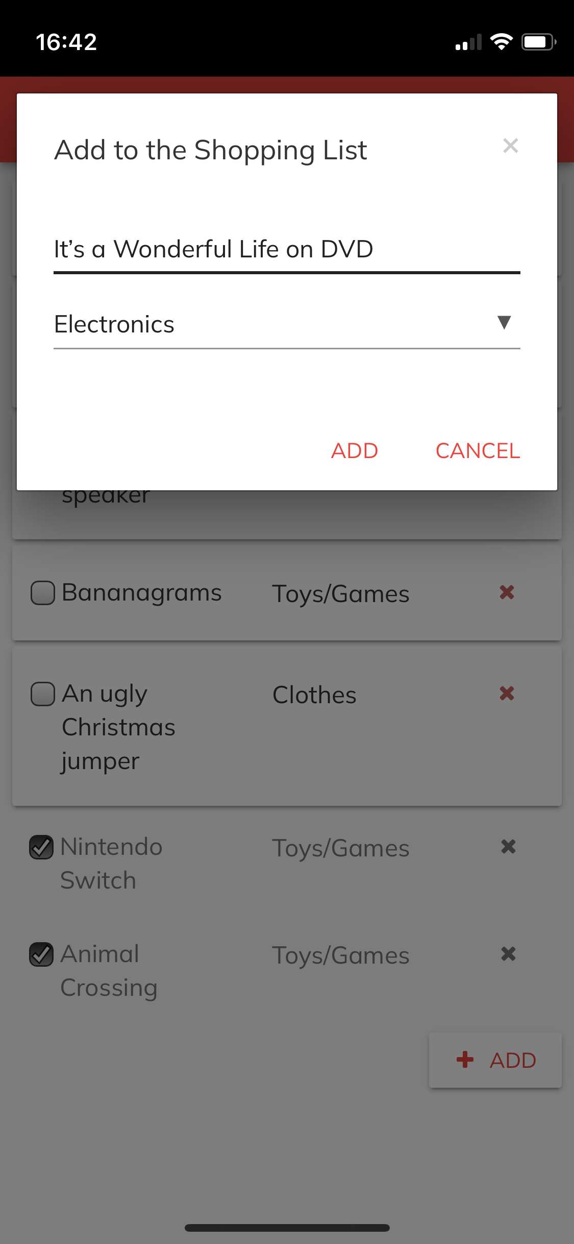 Adding to the shopping list is done through an alert where the user can add what they need to buy and choose a category for the item.