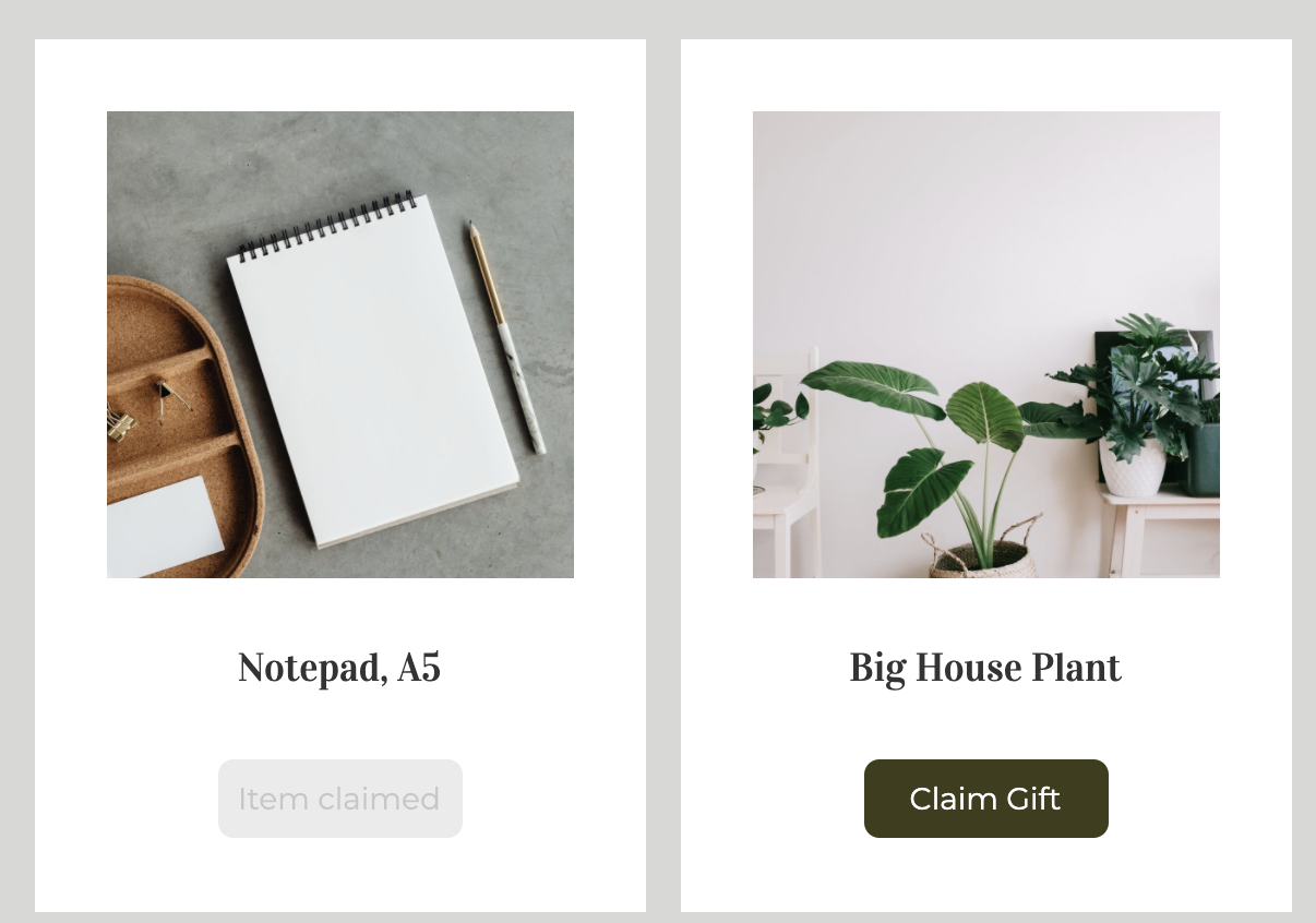 I want my friends to be able to claim a gift, so that other people won’t buy me the same thing, so each gift component has a claim_button. When clicked, this displays an alert so that someone can claim the gift they want to buy me: