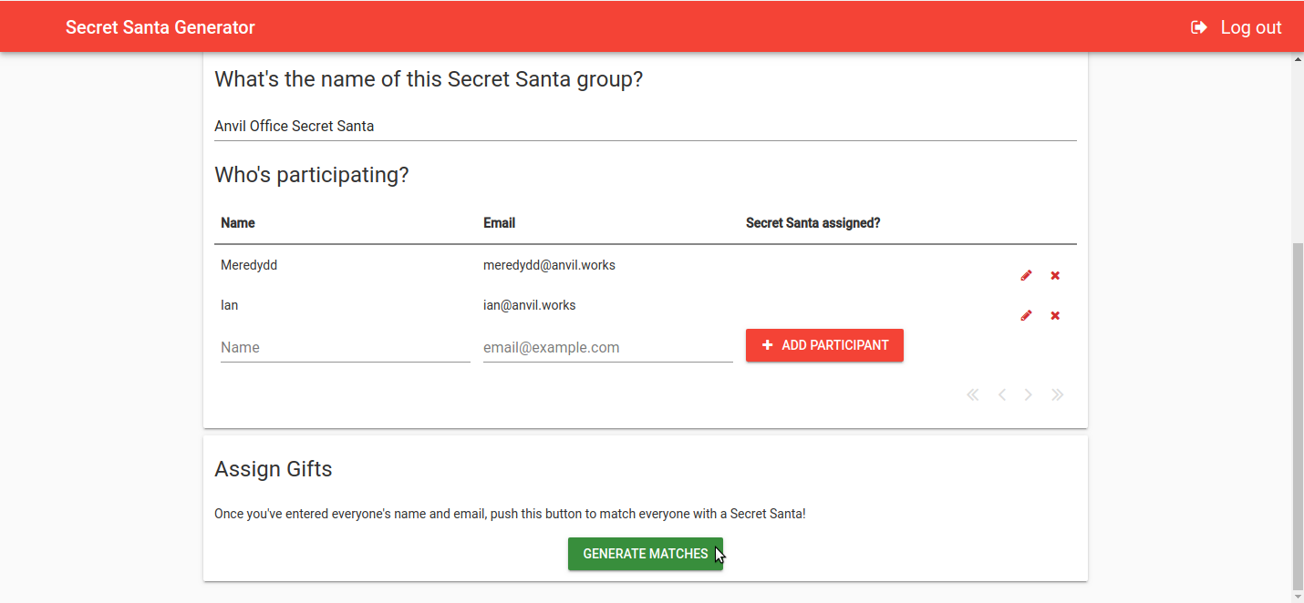 The first step is for the organiser to enter the names and email addresses of everyone who’s participating. This is a pretty straightforward multi-user CRUD app (that’s Create/Read/Update/Delete), as seen in our CRUD and multi-user tutorials.
