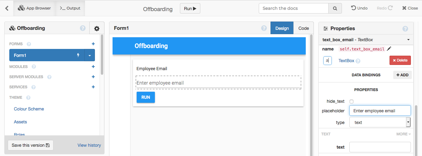We pass the employee’s email address into each of the scripts - later we’ll get this from the TextBox in the UI, so the HR team using the app can specify which employee to offboard.