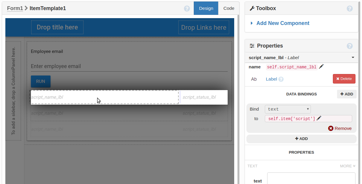 And we’ll create some Data Bindings to display the script name and status in the Labels: