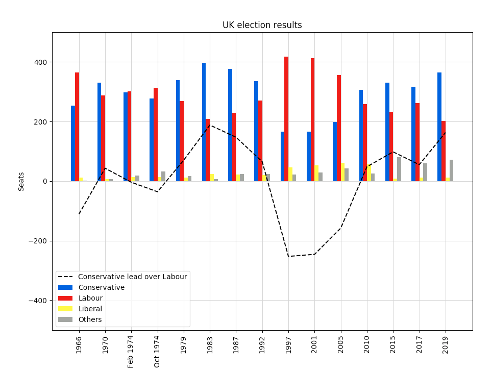 I’ll show you the basics of plotting in Matplotlib by creating a bar chart with grouped bars. It shows election results for the UK between 1966 and 2020: