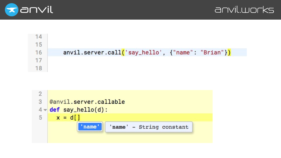 Speaking of function calls, we also need to infer between modules. For example, in Anvil you write your server code in Python, and you call it from the client with a Python function call. And if you pass something into that server code, you want to be able to autocomplete it inside that server function.