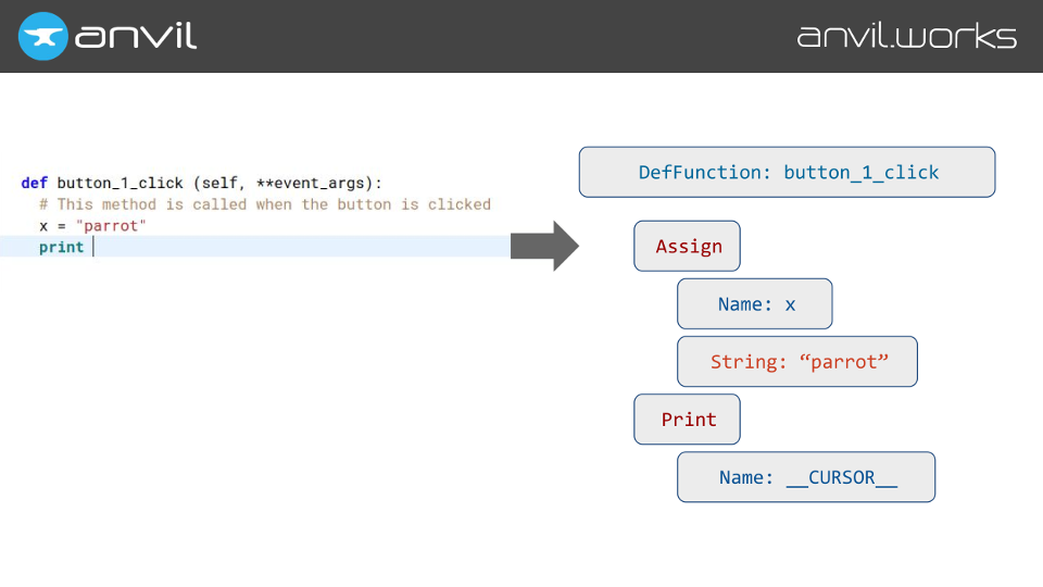 Conveniently, because Anvil runs all your client-side Python code in the browser, we have a Javascript parser for Python just lying around the place. (We use the open-source Skulpt project.)