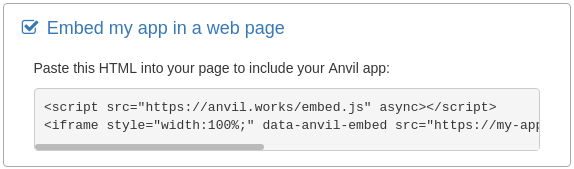 We’ve made it easier to embed Anvil apps in other websites. When you open the Publish dialog, you now get a checkbox for “Embed this app in” a web page". Enable it, then copy and paste the HTML snippet into any website to include your Anvil app there!