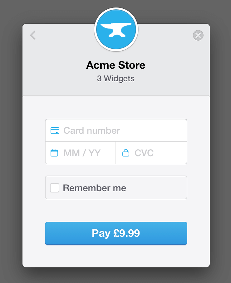 To take a credit card payment from your app, call stripe.checkout.charge, supplying your required currency and the amount in pence (or equivalent). Make sure you import stripe.checkout first.