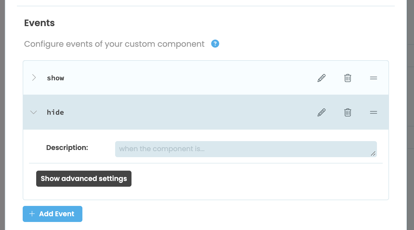 In the Custom Component Configuration dialog, you can configure advanced settings for your custom event. Click the event you want to configure to expand the menu, then choose ‘Show advanced settings’.