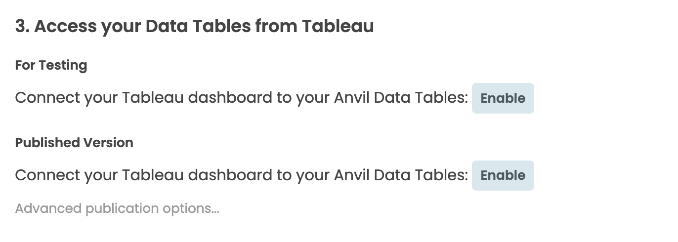 Scroll down to “Access your Data Tables from Tableau”, and click Enable: