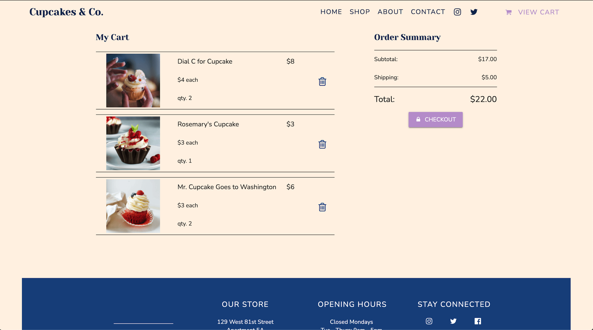 When there are items in self.cart_items, the View Cart page displays the names, quantities, prices, and images of the cart items in a RepeatingPanel. On the right side of the page is the order summary, which displays the subtotal of the order. Items can be removed from the cart if the trash can icon is clicked. This removes the item from self.cart_items and reloads the Cart form.