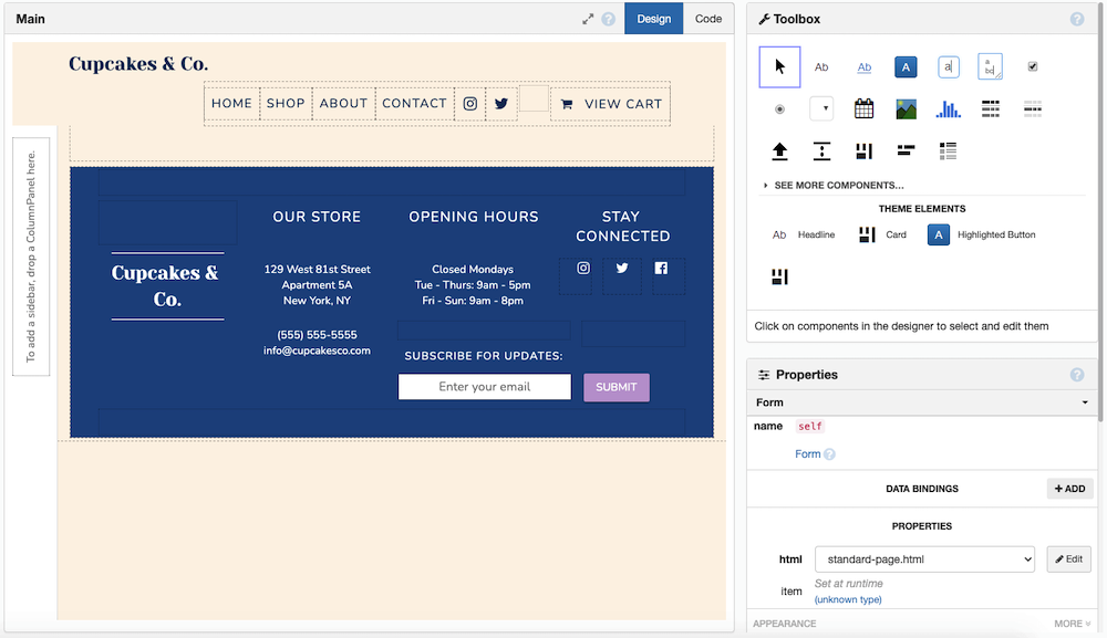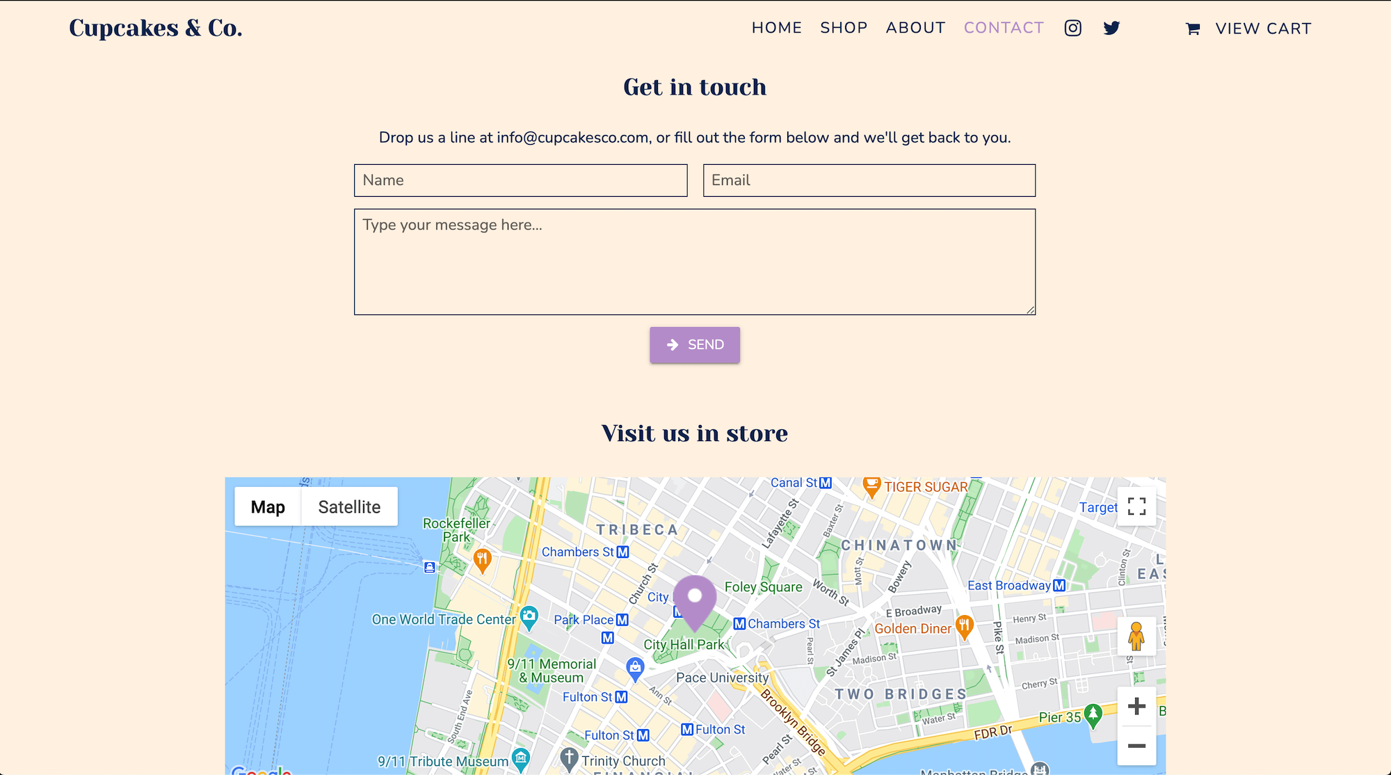 The shop template also includes a Contact page, which includes a form for leaving a message with the company. The name, email and message are stored in the contact Data Table. A Google Maps component displays the location of the company and uses a custom designed marker.