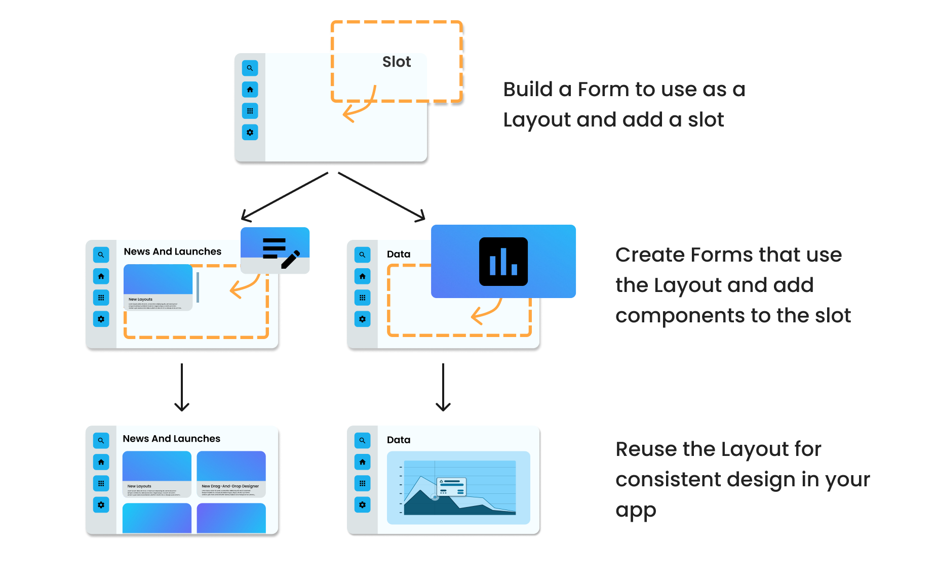 In Anvil, a Layout is a Form that can be used by other Forms to define their structure. A Layout Form can have components added to it. Any Form using the same Layout will all have those same components. When you create a Layout Form, you add Slots into the design. Slots define where Forms using the Layout can add components.